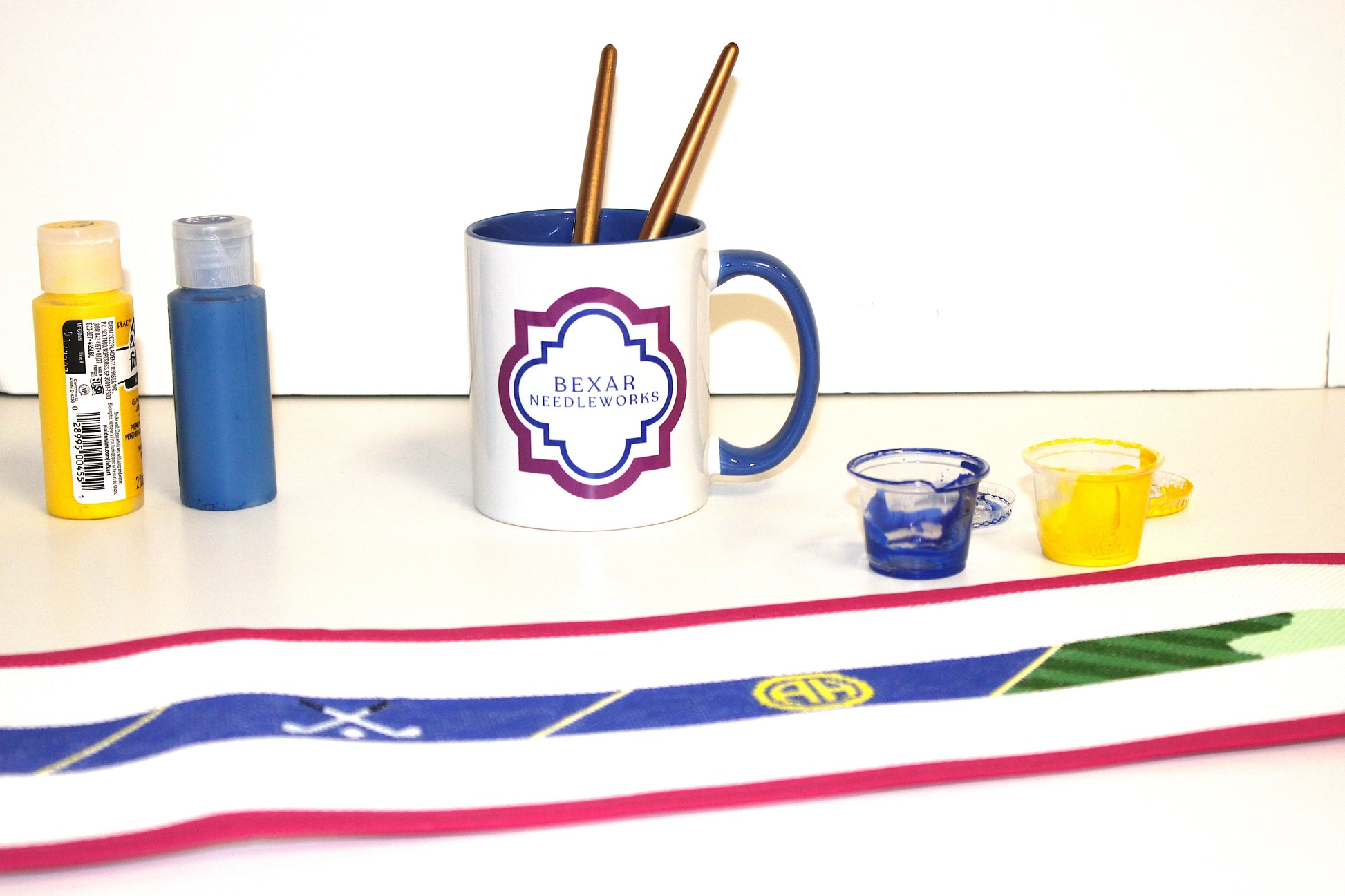 Stitch your pride with a needlepoint canvas featuring the iconic Alamo Height's Mules logo and golf clubs. This design is charted for a rewarding project, resulting in a timeless belt for students and alumni alike.