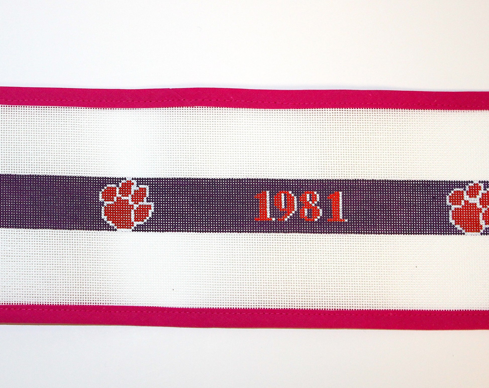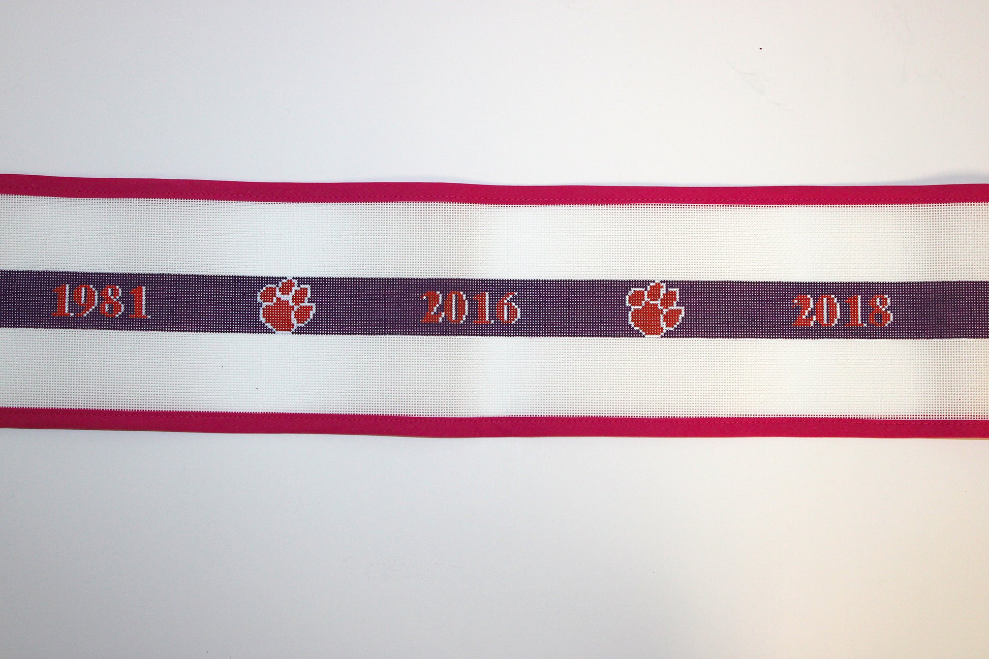 Stitch a tribute to gridiron greatness with this Clemson Championship Belt needlepoint canvas. The design features the iconic Tiger paws framing the years of Clemson’s national football titles. Create a timeless, handcrafted heirloom that proudly displays your Tiger pride and championship legacy.