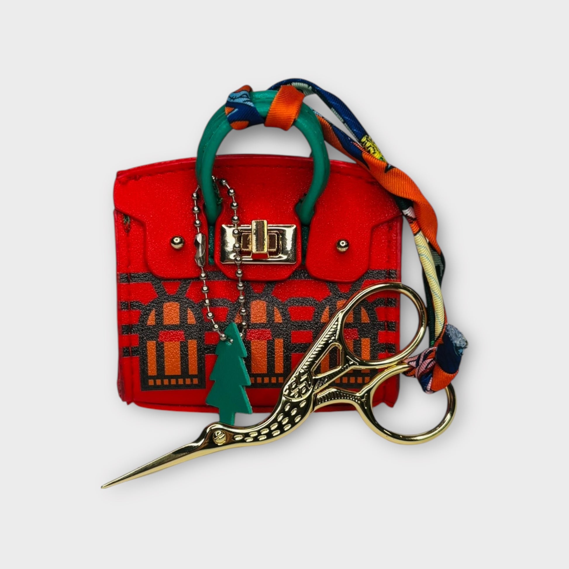 Christmas colored bag with miniature Christmas tree bag tag attached to gold crane scissors